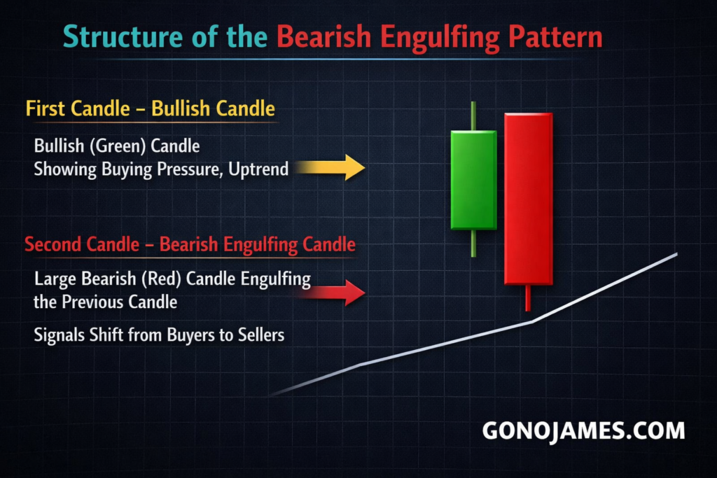 To properly identify a Bearish Engulfing candlestick pattern, you must understand its structure: