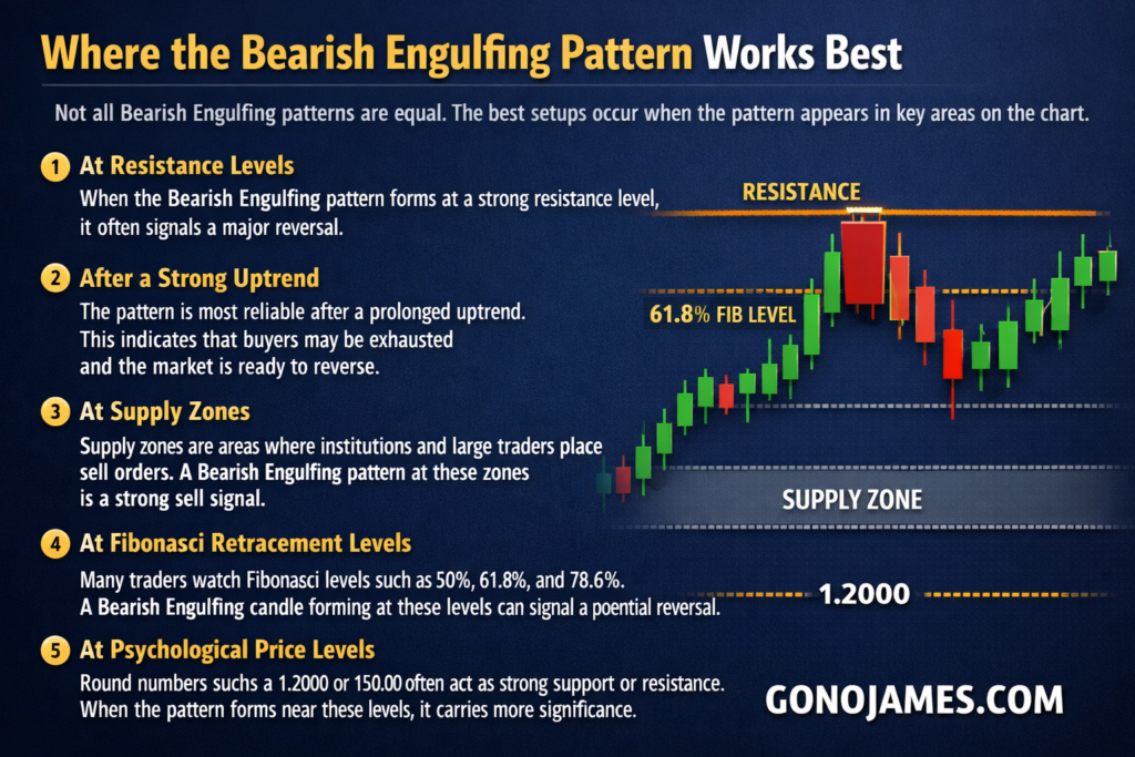 Not all Bearish Engulfing patterns are equal. The best setups occur when the pattern appears in key areas on the chart.
