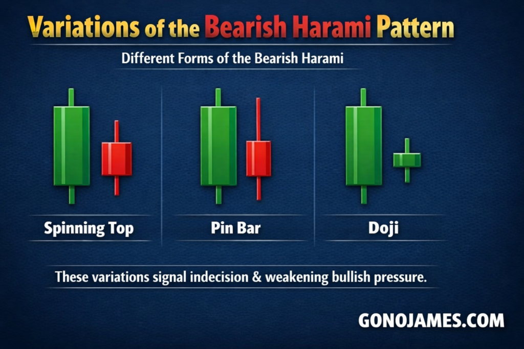 There are several variations of the Bearish Harami pattern. While the standard pattern is the most common, experienced traders also watch for variant structures.