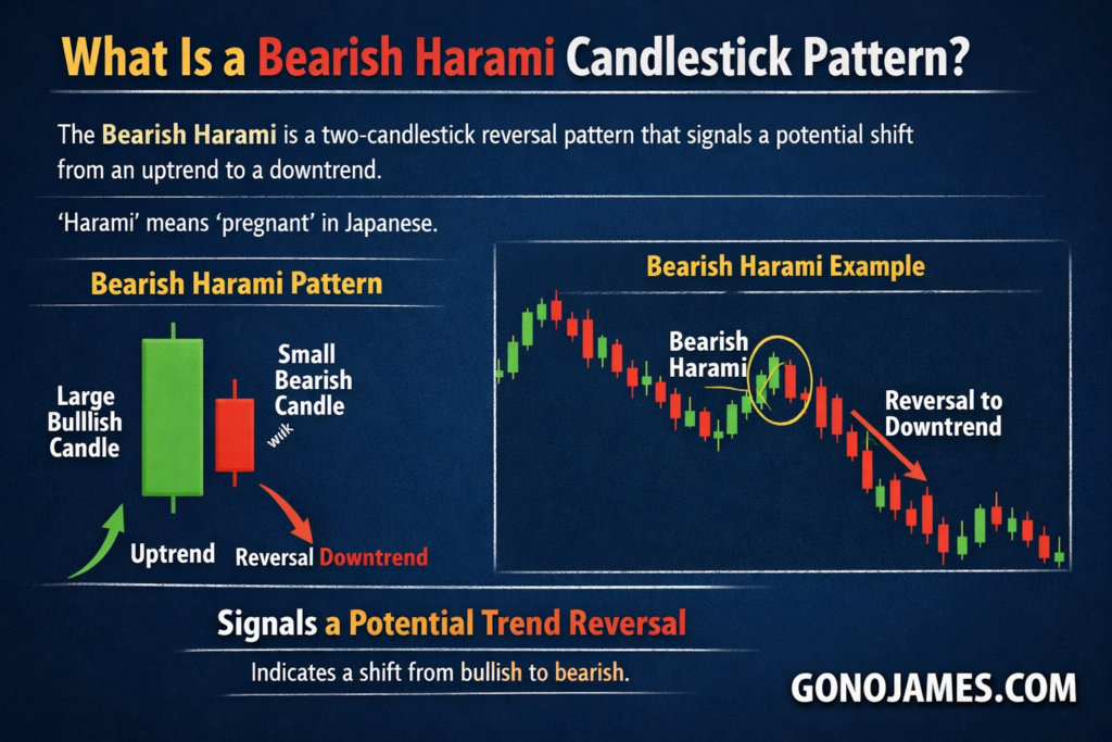 The Bearish Harami is a popular two-candlestick reversal pattern that signals a potential shift from an uptrend to a downtrend. The word “Harami” comes from Japanese and means “pregnant,” which describes the visual appearance of this pattern. It looks like a small candle inside a larger candle, similar to a baby inside a mother’s body.