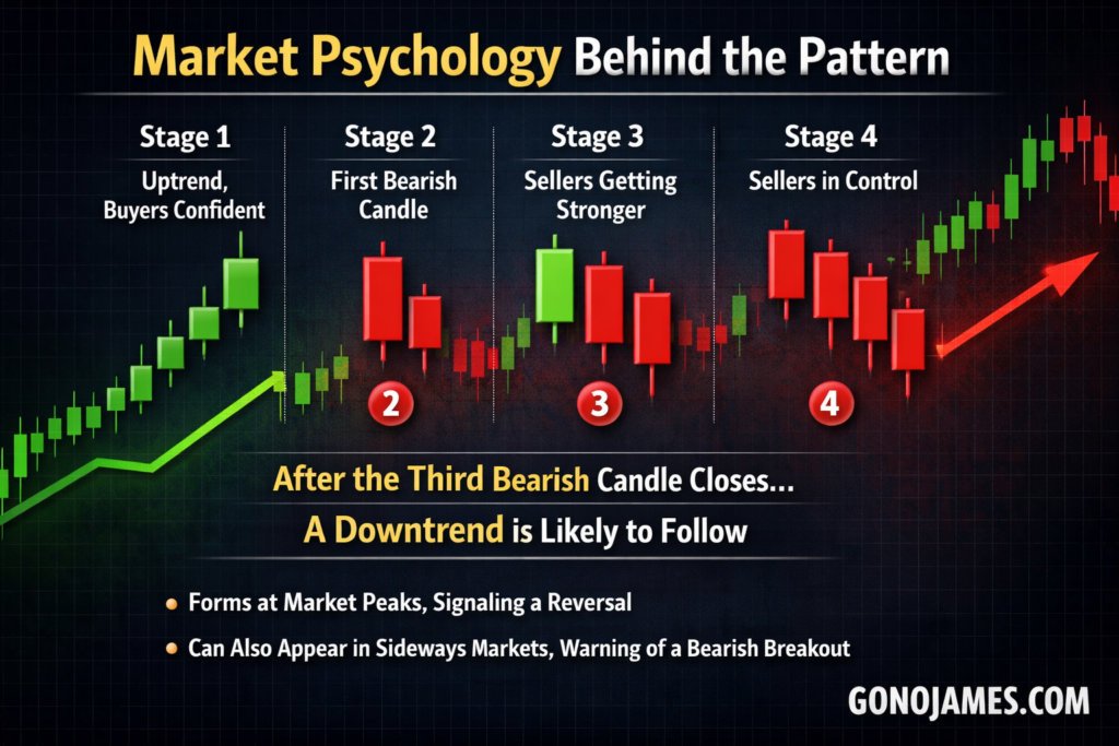 The Three Black Crows pattern reflects a clear shift in market psychology. It shows that buyers who previously dominated the market are losing strength, while sellers are gaining control.