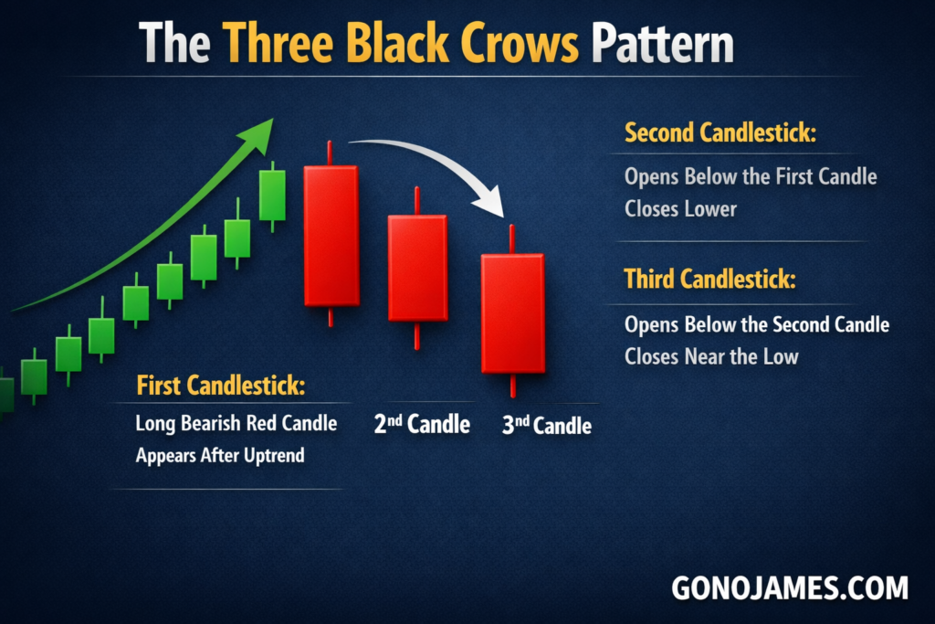 The pattern consists of three consecutive bearish candlesticks that close progressively lower. These candles reflect strong selling pressure and a gradual shift in market sentiment from bullish to bearish.