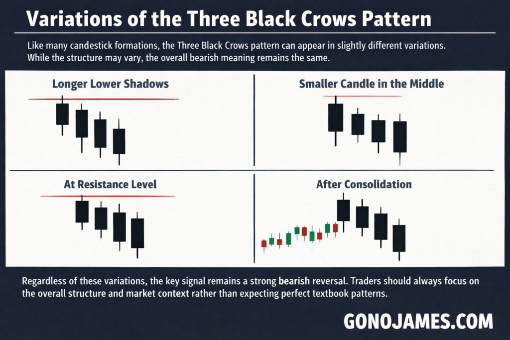 Like many candlestick formations, the Three Black Crows pattern can appear in slightly different variations. While the structure may vary, the overall bearish meaning remains the same.