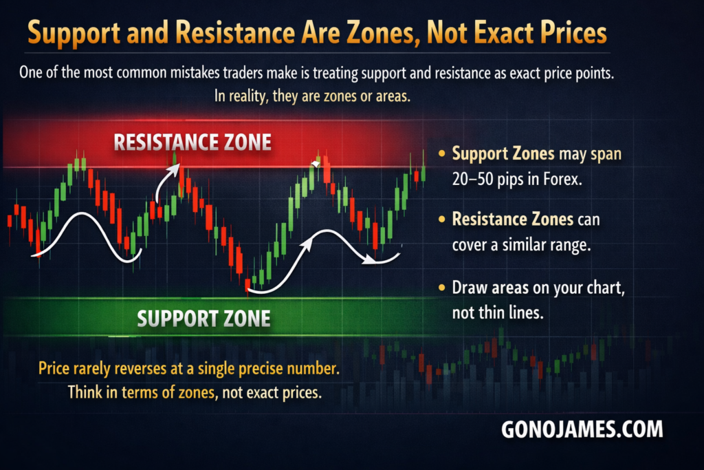 One of the most common mistakes traders make is treating support and resistance as exact price points. In reality, they are zones or areas.