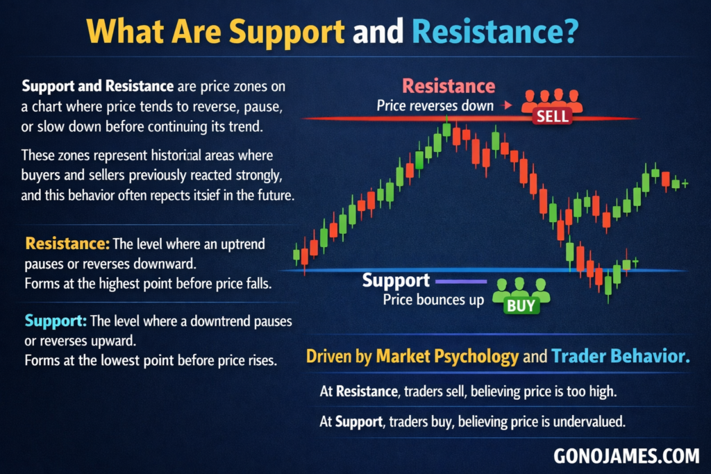 Support and Resistance are price zones on a chart where price tends to reverse, pause, or slow down before continuing its trend. These zones represent historical areas where buyers and sellers previously reacted strongly, and this behavior often repeats itself in the future.