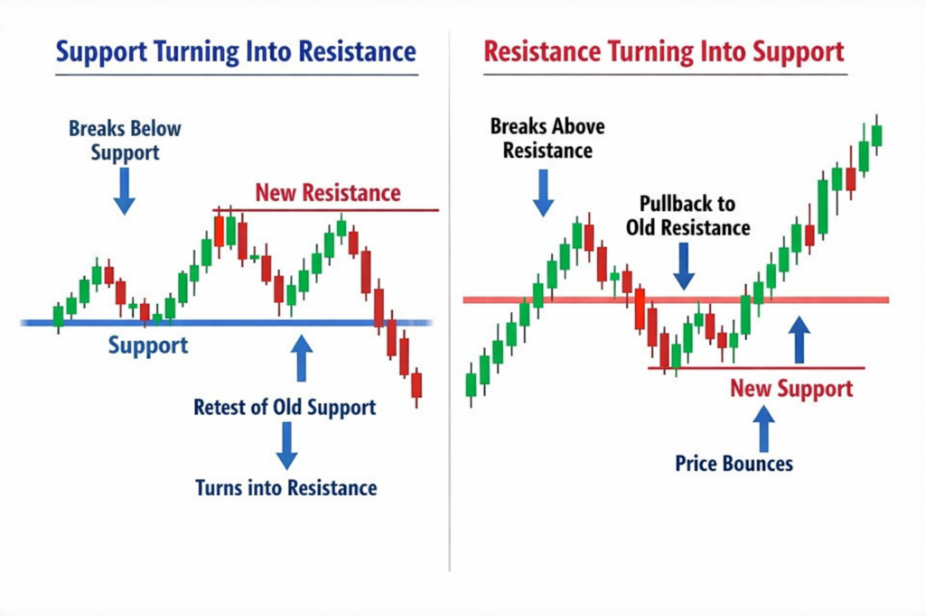 Understanding this role change helps traders identify strong entry points and confirm new trends.