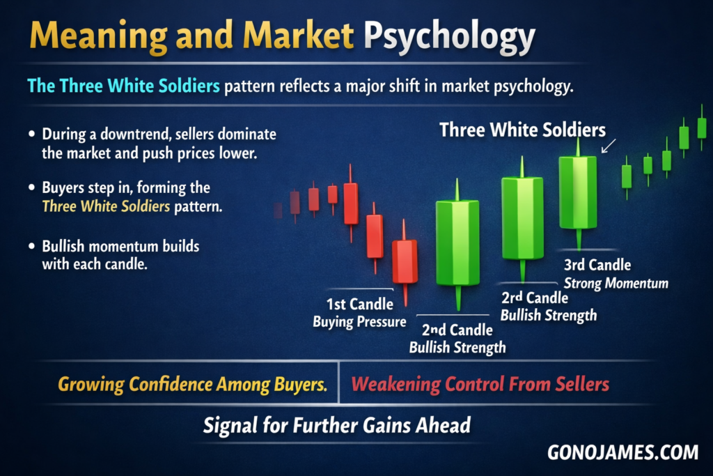 During a downtrend, sellers dominate the market and push prices lower. However, when the Three White Soldiers pattern begins to form, buyers gradually step in and gain control.