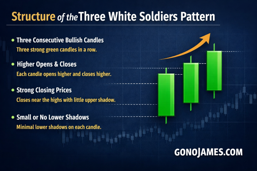 To identify the Three White Soldiers pattern correctly, traders must understand its structure. The pattern consists of three consecutive bullish candles that follow a downtrend or consolidation phase.