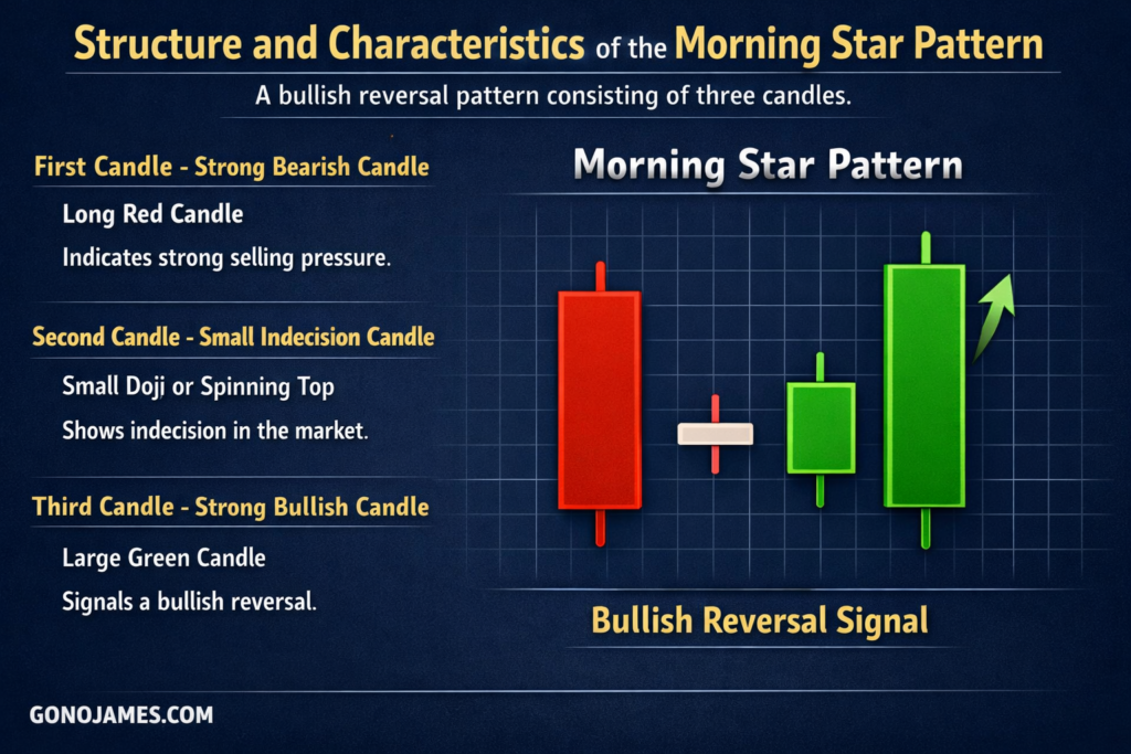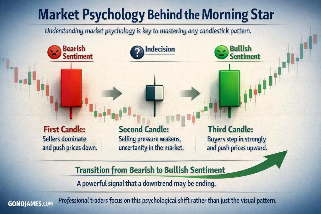 The Morning Star is one of the most reliable candlestick patterns because it reflects a clear shift in market sentiment. Sellers dominate the first phase, indecision appears in the second phase, and buyers take over in the final phase.