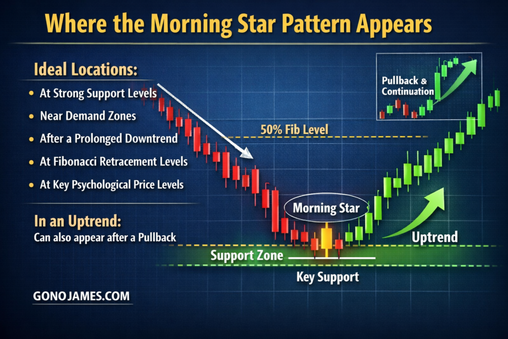 The Morning Star pattern is most effective when it appears at the end of a downtrend. This is where it has the highest probability of signaling a bullish reversal.