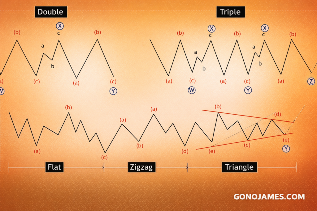While basic corrective patterns such as Zigzags, Flats, and Triangles are relatively easy to identify, markets often display more complex corrective structures. This is where Double Three and Triple Three patterns become extremely important.